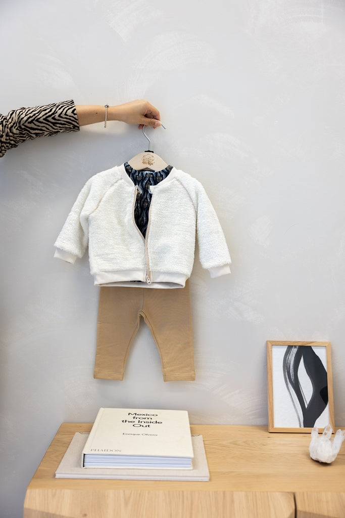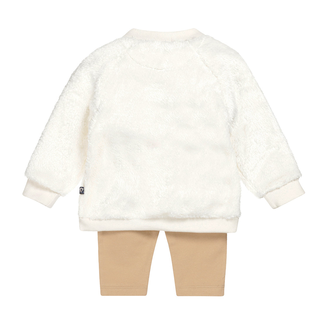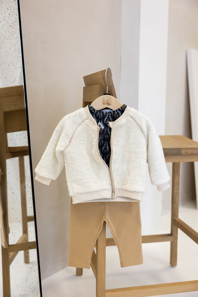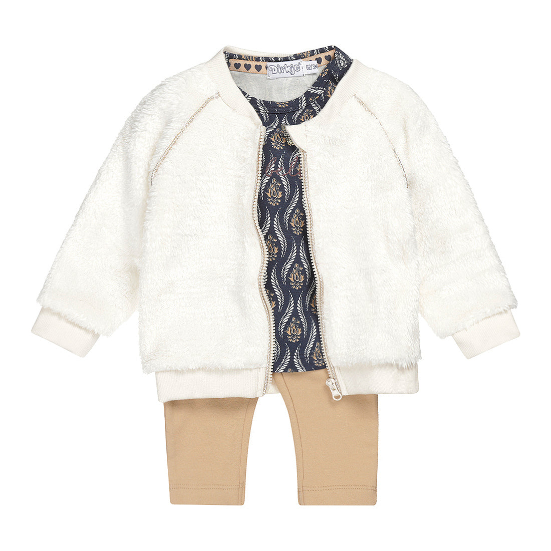 3-delige set voor meisjes. Het bestaat uit een vestje, T-shirt met lange mouwen en broekje. Het vestje is in een zachte teddy, afgewerkt met gouden accenten. De T-shirt met lange mouwen is in de kleur donkerblauw met beige print met als opschrift “la vie est belle”. Het beige komt ook terug in de broek.