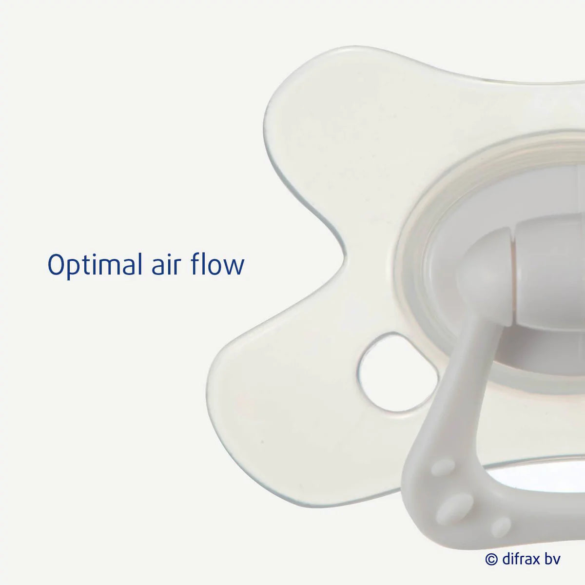 Deze unieke fopspeen heeft een vlindervormig schildje, waardoor de fopspeen mooi past op het gezicht van je baby. De neusuitsparing zorgt ervoor dat je baby vrij kan ademen door de neus. Door de gaatjes is er extra luchttoevoer, wat huidirritatie voorkomt.
