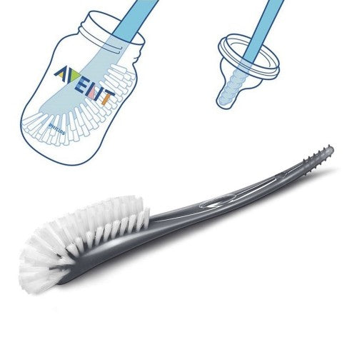 De Philips Avent-flessenborstel heeft een speciaal ontwikkelde gebogen borstel en een geribbeld uiteinde, om alle soorten flessen, spenen en producten voor babyvoeding effectief te kunnen schoonmaken. De duurzame, dicht op elkaar geplaatste borstelharen reinigen veilig en zonder krassen.