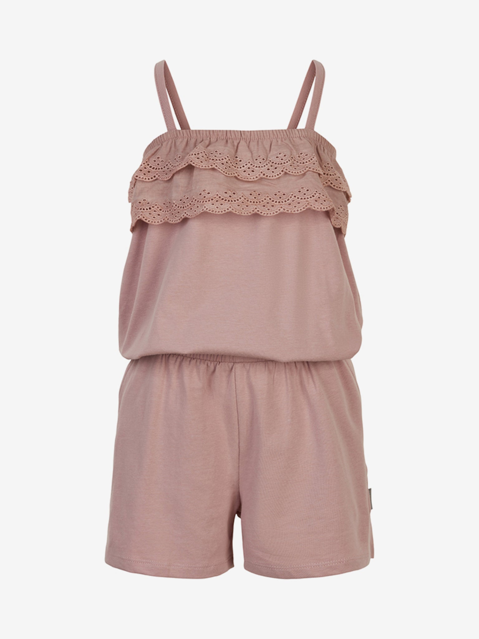 De jumpsuit heeft zakken aan de voorkant en meer lagen katoenen franje met katoenen kanten rand rond de borst.