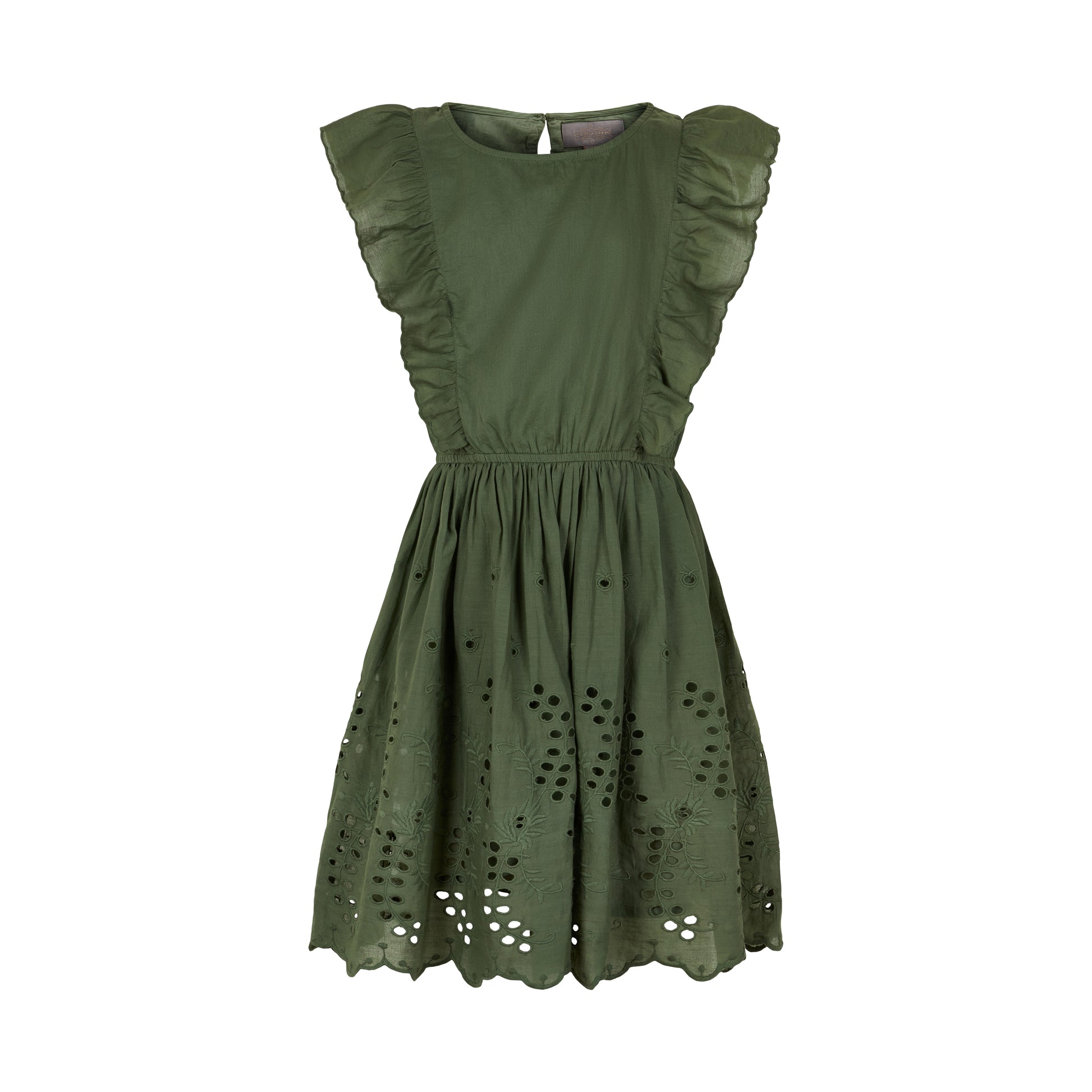 Schattig mouwloos jurkje met broderie anglaise op de rok. De jurk sluit met een knoopje op de rug. Grote ruches aan de zijkanten. Elastiek in de taille. De jurk is gemaakt van 100 % katoen.