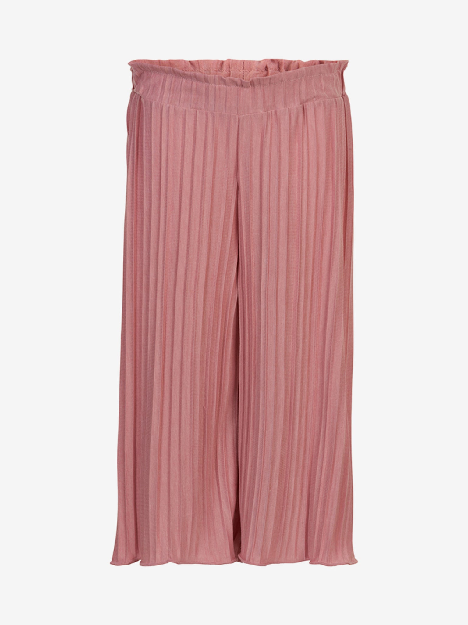 De broek heeft wijde pijpen en elastiek in de taille met franje aan de bovenkant.