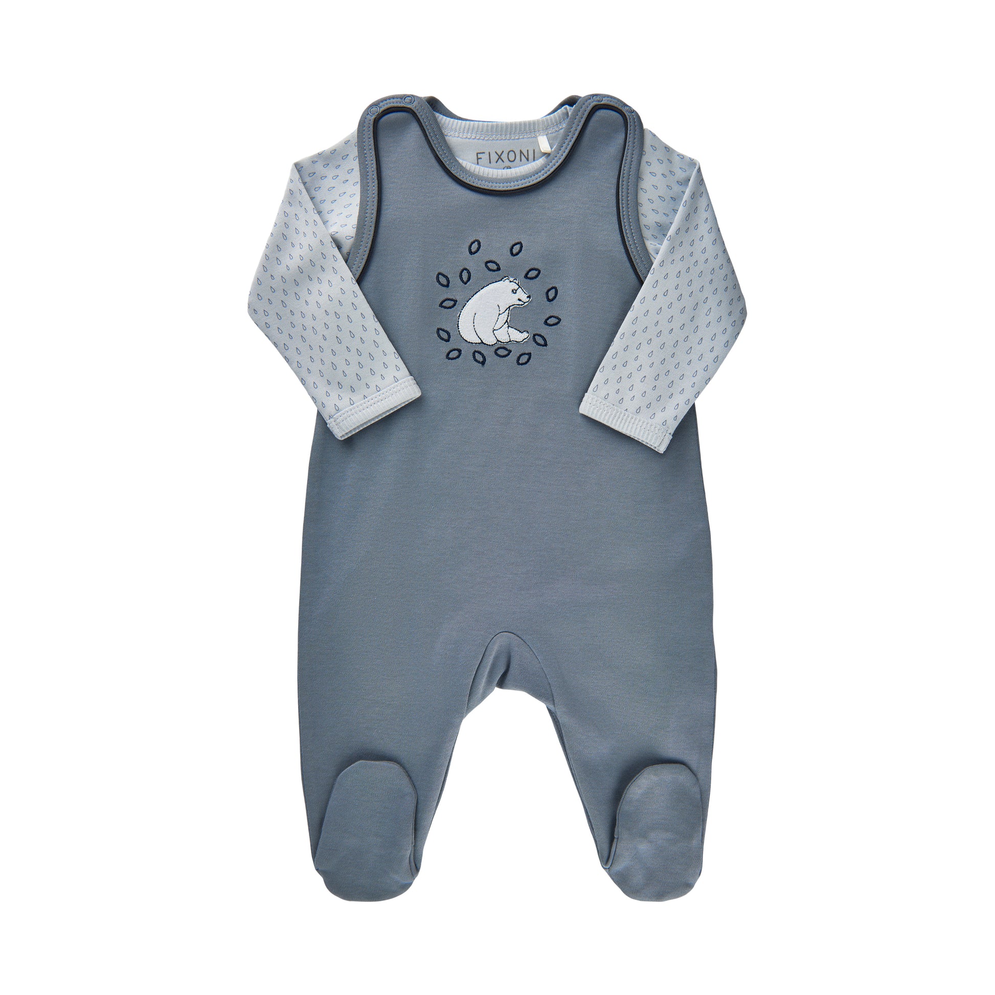 Deze pyjama bestaat uit een T-shirt met lange mouwen en een romper met voetjes aan.