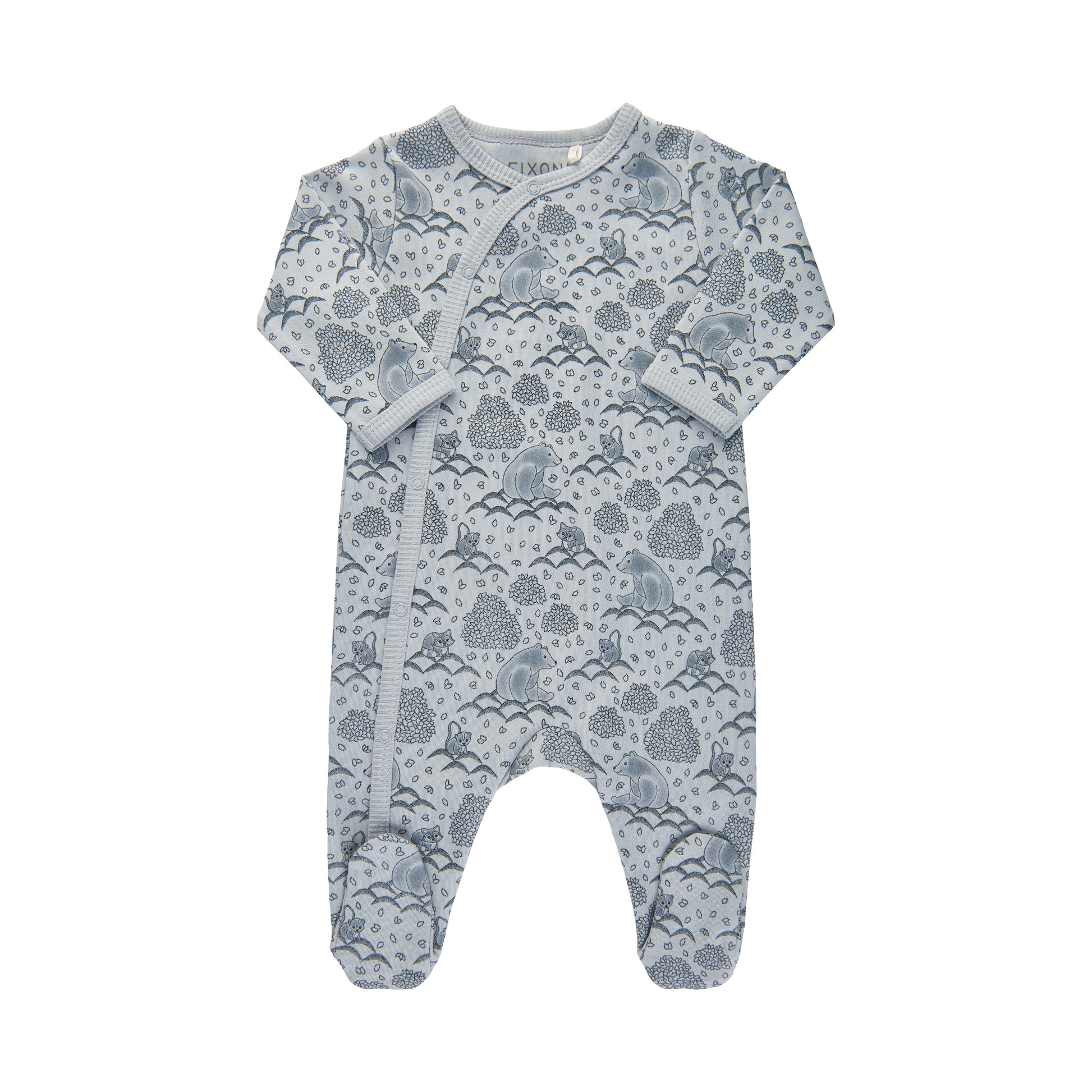 Het pak is uitgevoerd in een leuke print, heeft lange mouwen en voetjes.