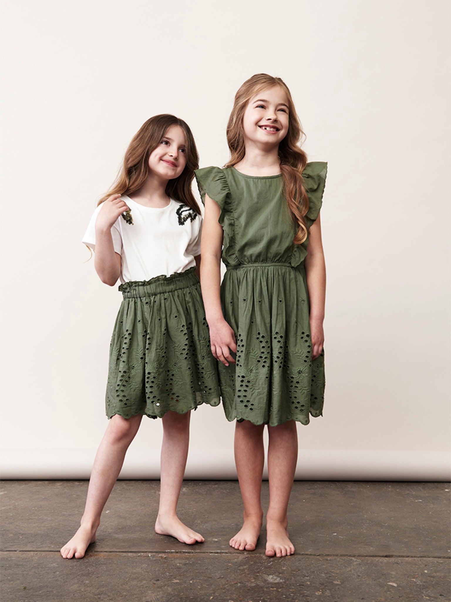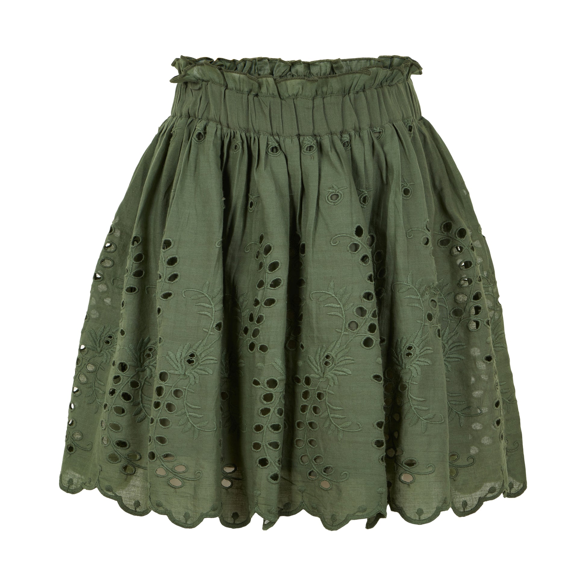 De rok heeft rimpels langs het elastiek in de taille waardoor er franjes rondom ontstaan. Het is gemaakt van 100 % katoen en heeft mooie geborduurde details.