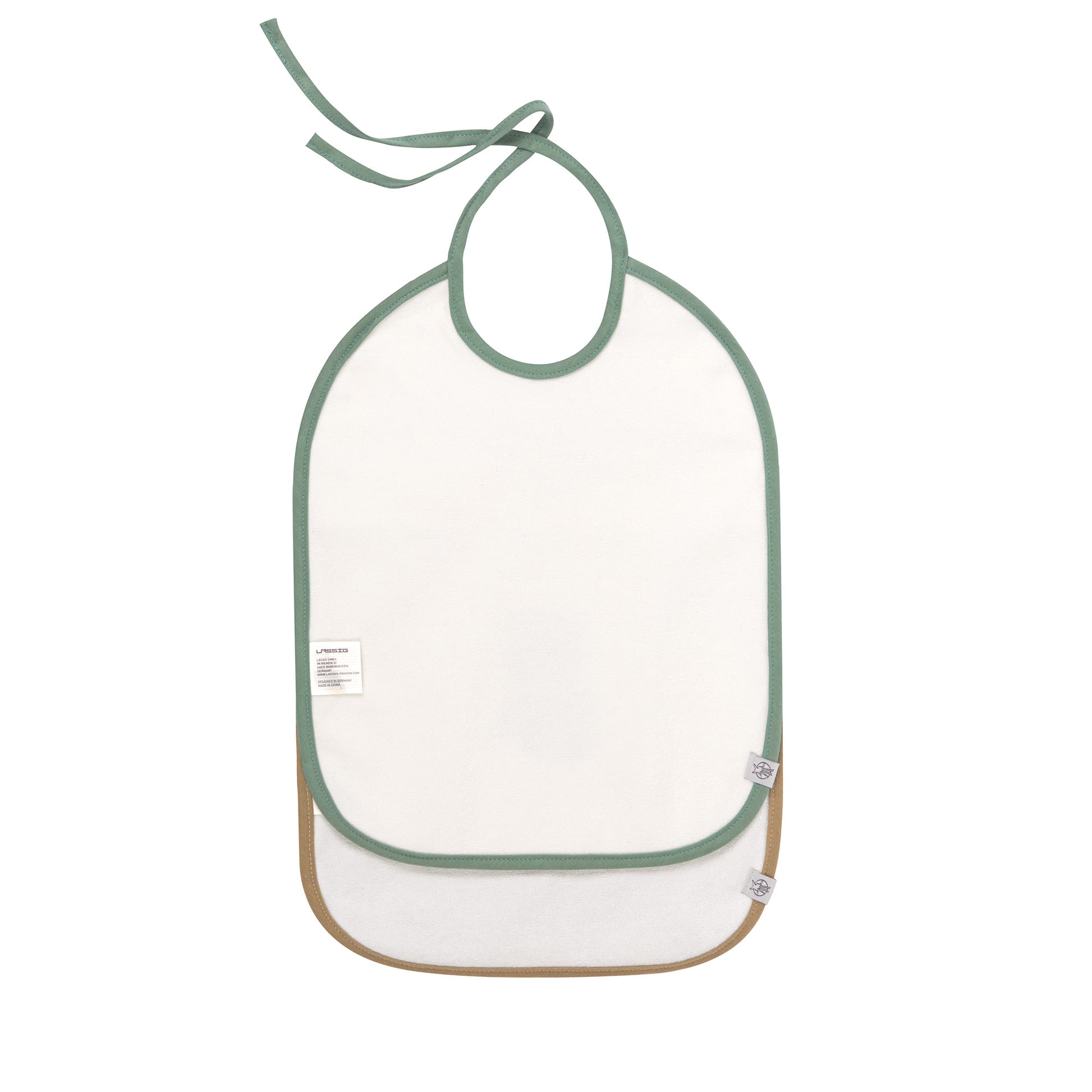 Onderhoudsvriendelijke, middelgrote slabbetjes uit de LÄSSIG About Friends babycollectie worden geleverd in sets van twee met bandjes voor individuele aanpassing.