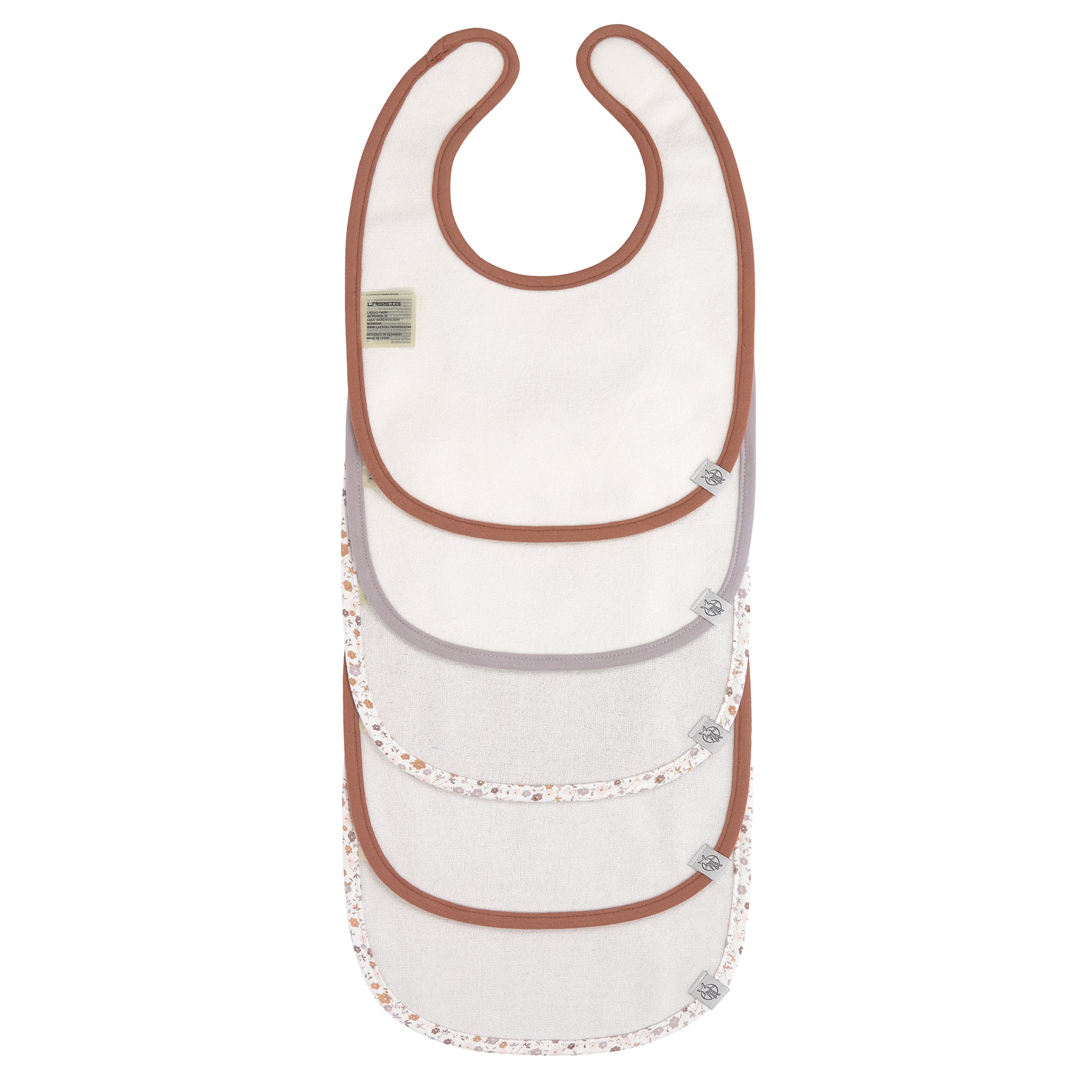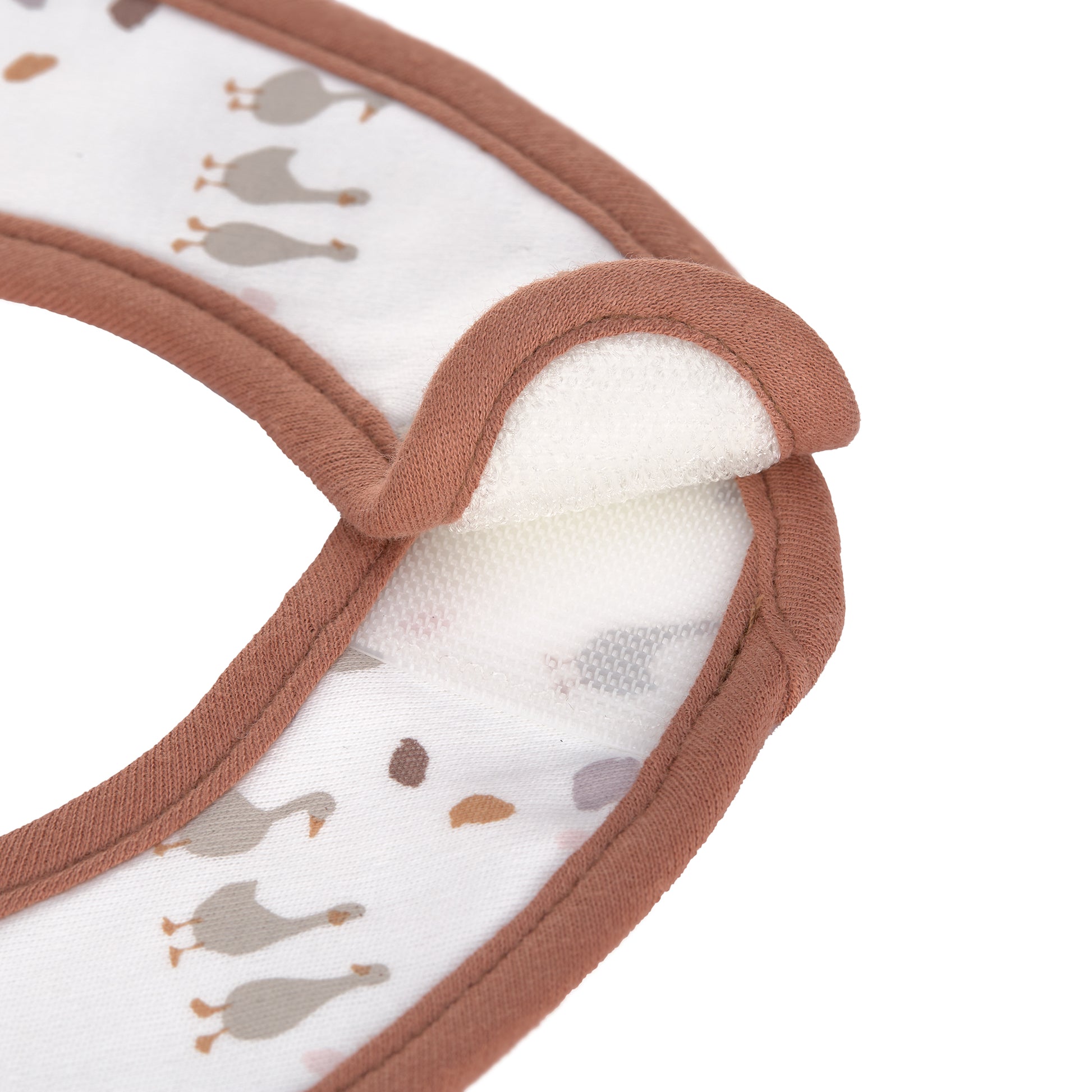 De slabbetjes, die in meerdere assortimenten worden verkocht, hebben een klittenbandsluiting aan de achterkant en zijn gemaakt van onderhoudsvriendelijk biokatoen/polyestermix en hebben een waterdichte binnenvoering om de babykleding eronder absoluut droog te houden.