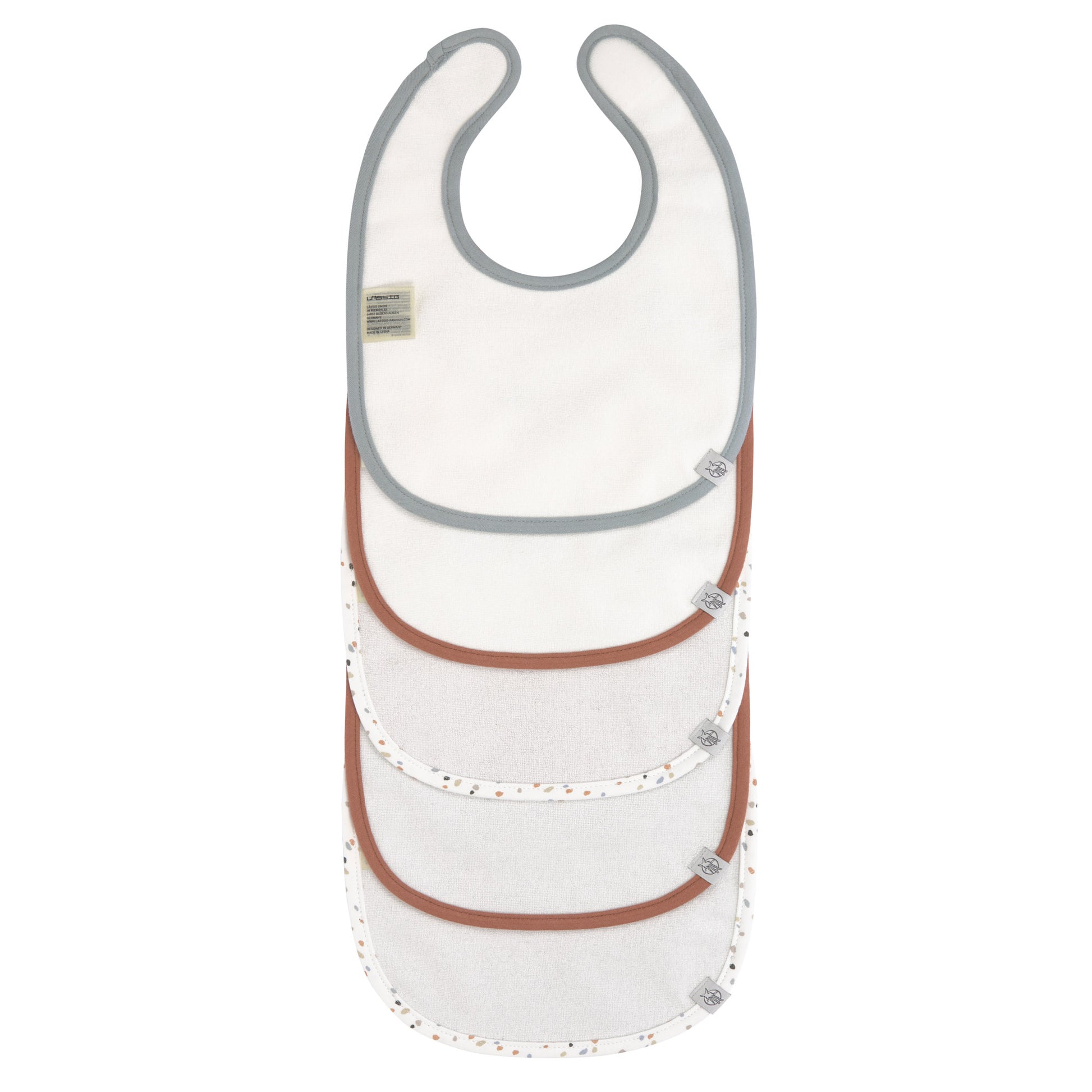 De slabbetjes, die in meerdere assortimenten worden verkocht, hebben een klittenbandsluiting aan de achterkant en zijn gemaakt van onderhoudsvriendelijk biokatoen/polyestermix en hebben een waterdichte binnenvoering om de babykleding eronder absoluut droog te houden.