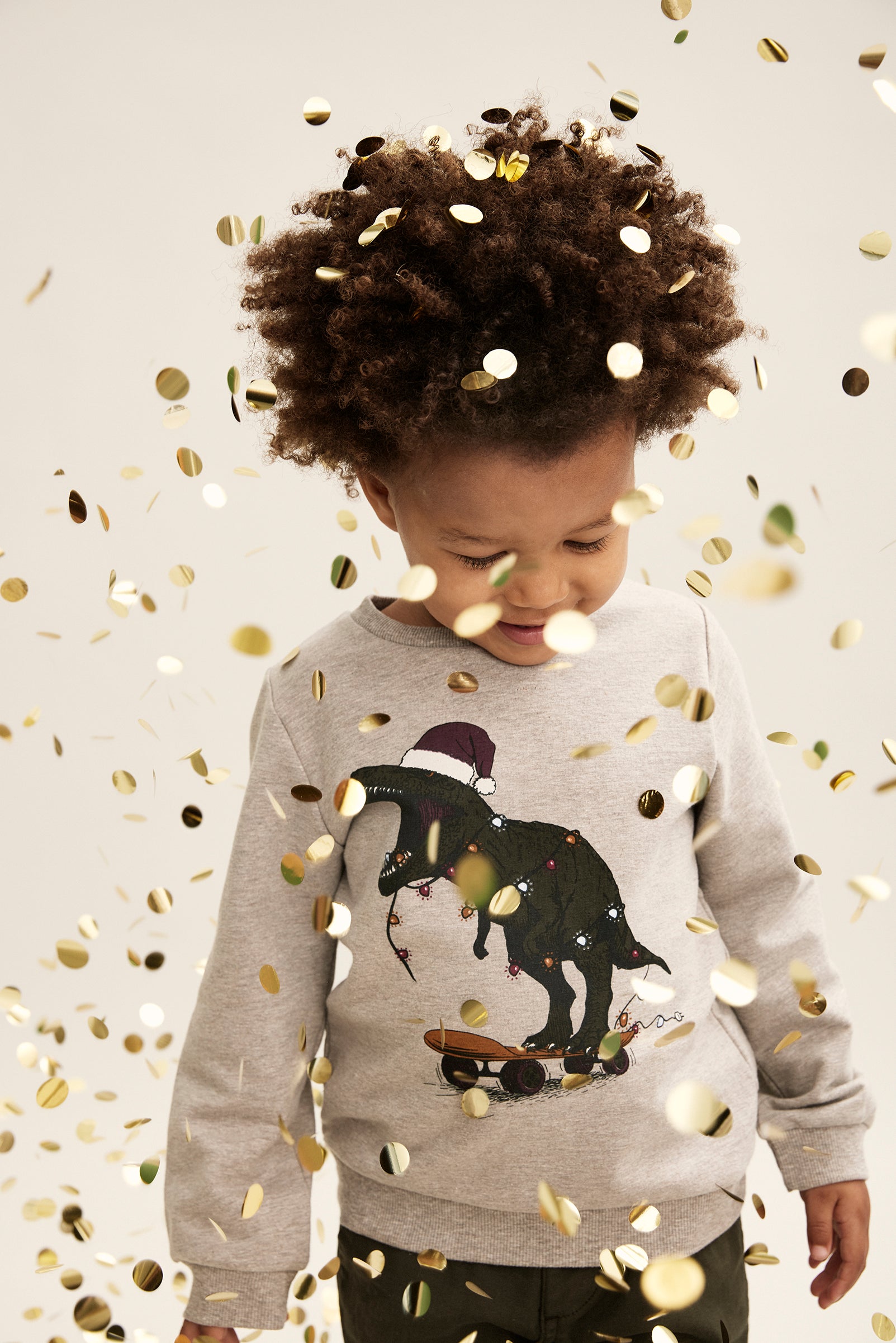Op de voorkant staat een print van een dinosaurus met een elfenmuts en kerstlichtjesketting.