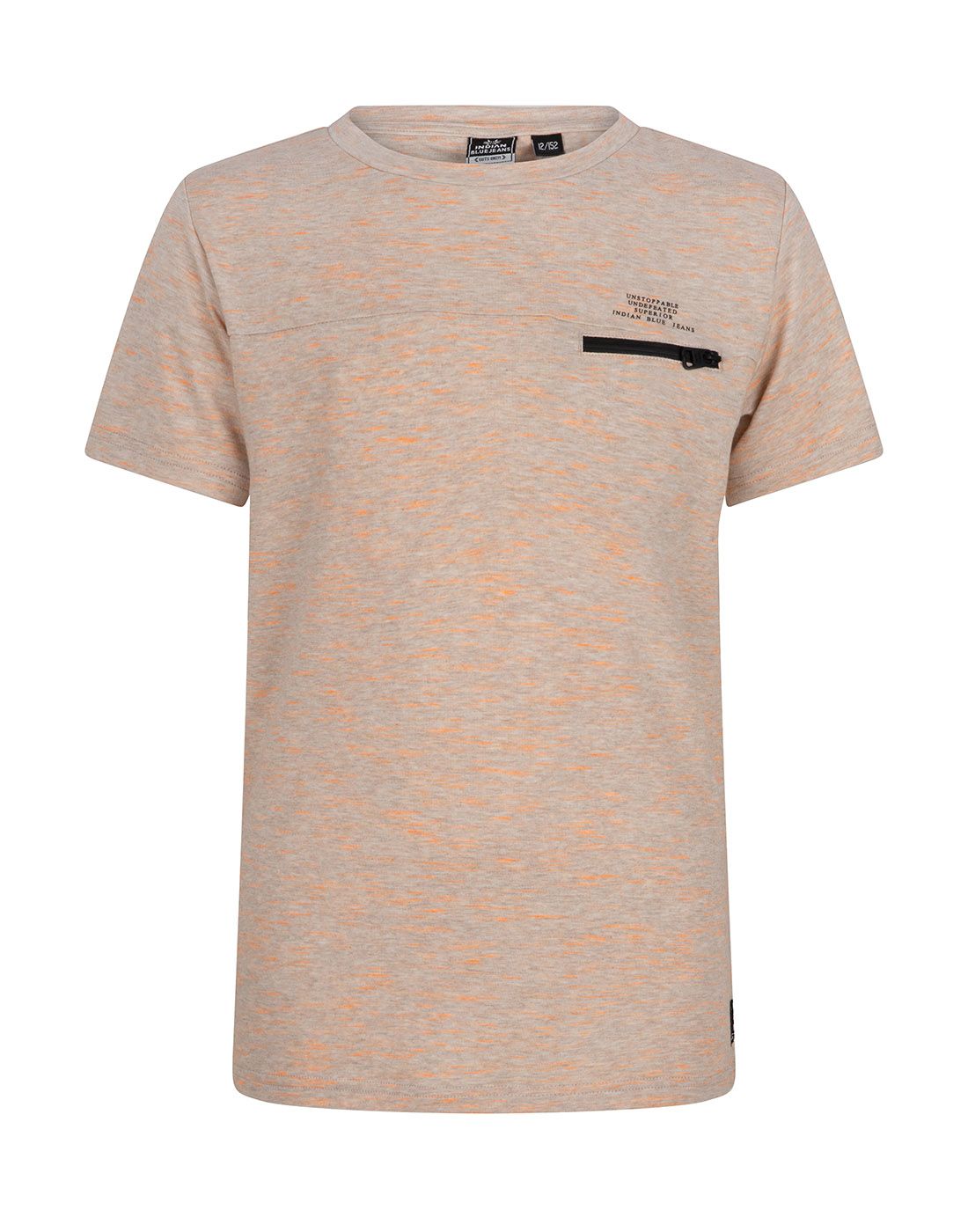 Zand kleurig T-shirt voor jongens heeft een all over melange print in de kleur oranje.