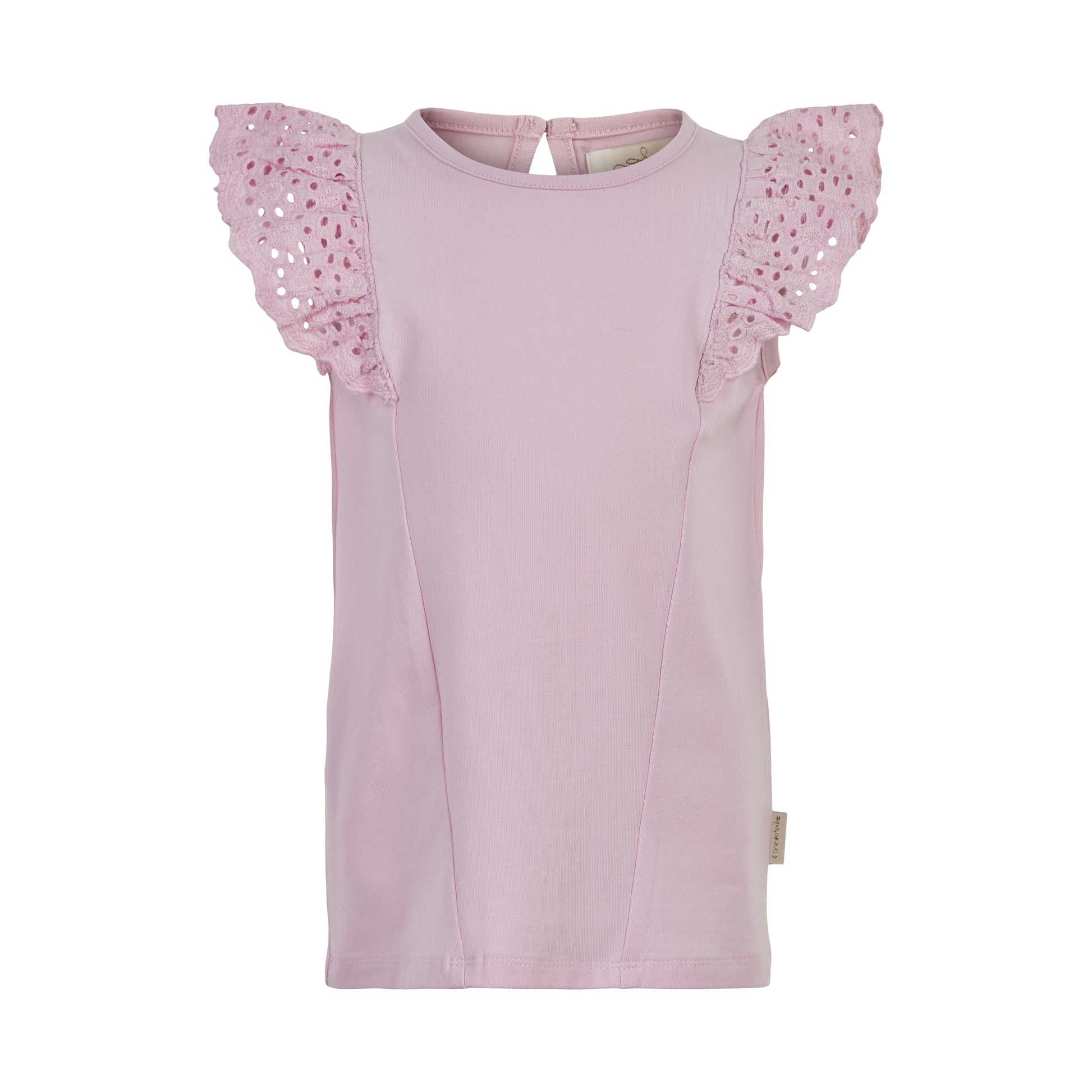 Mouwloos t-shirt met grote, mooie ruches op de schouders.
