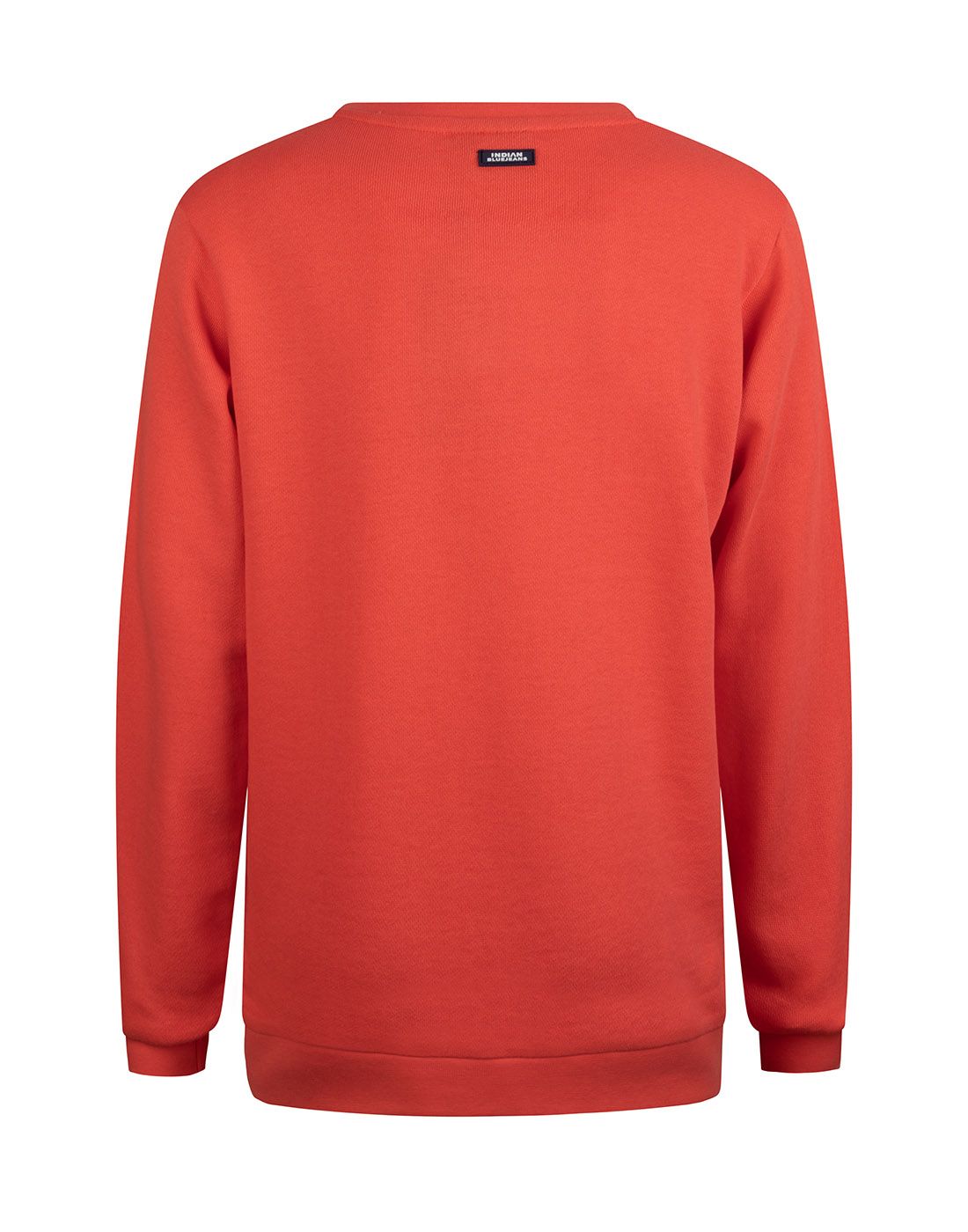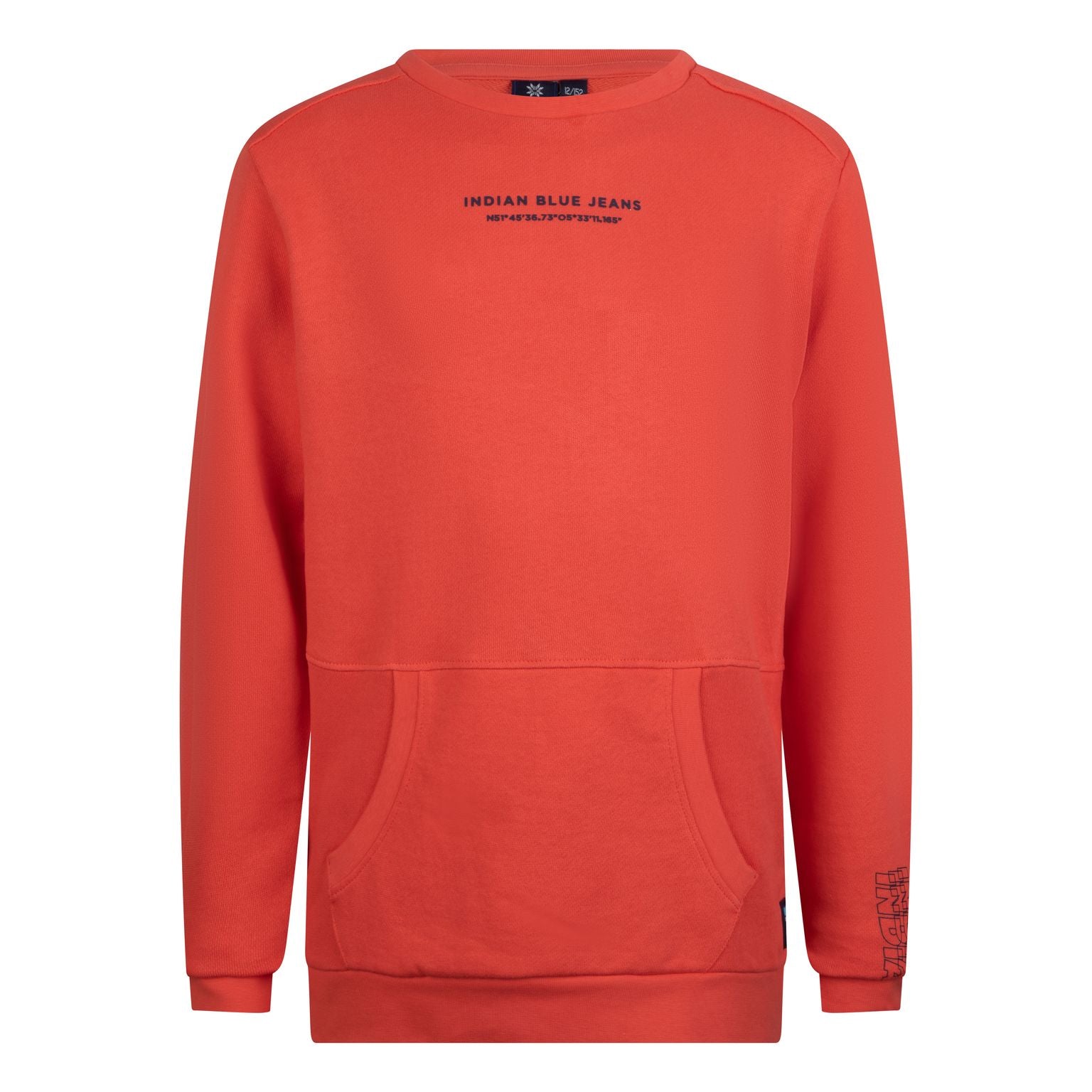 Een rode/oranje sweater voor jongens heeft een ronde hals.