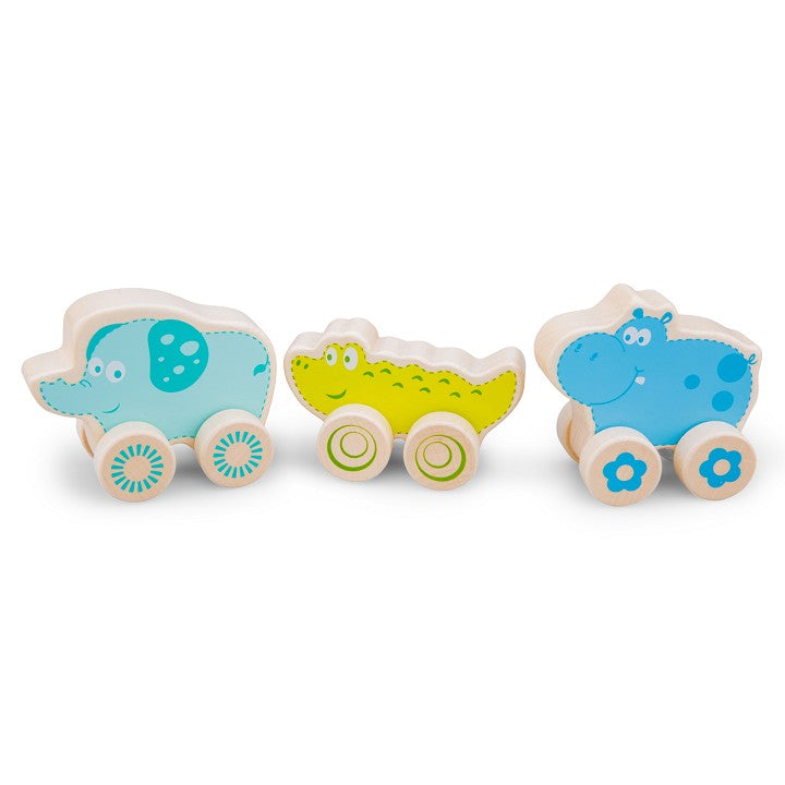 Een prachtige set van drie houten wheelie safari dieren in vrolijke kleuren voor eindeloos speelplezier. Ga met de safari dieren op tour en beleef de spannendste avonturen.